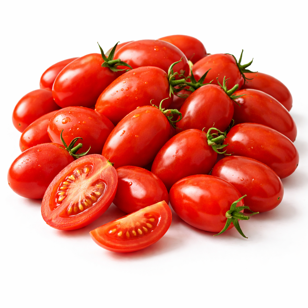 Freshly picked tomatoes with vibrant color and a rich, garden-fresh taste, offering the perfect balance of sweetness and acidity.